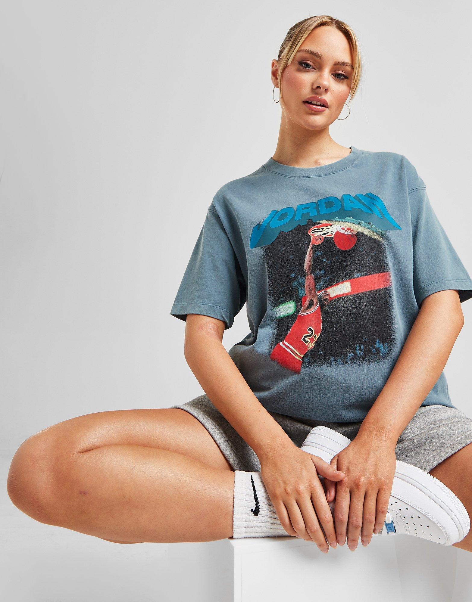 Eleva o teu estilo com a T-shirt Graphic Heritage para mulher da Jordan. Em azul Ozone Blue, tem corte relaxado e é feita em algodão leve e respirável. Com gola redonda, ombros descaídos e mangas curtas para aquele toque chill. O grafismo mostra o GOAT num afundanço icónico e é rematada com a palavra Jordan no peito. Lavável à máquina. A nossa modelo veste o tamanho S.